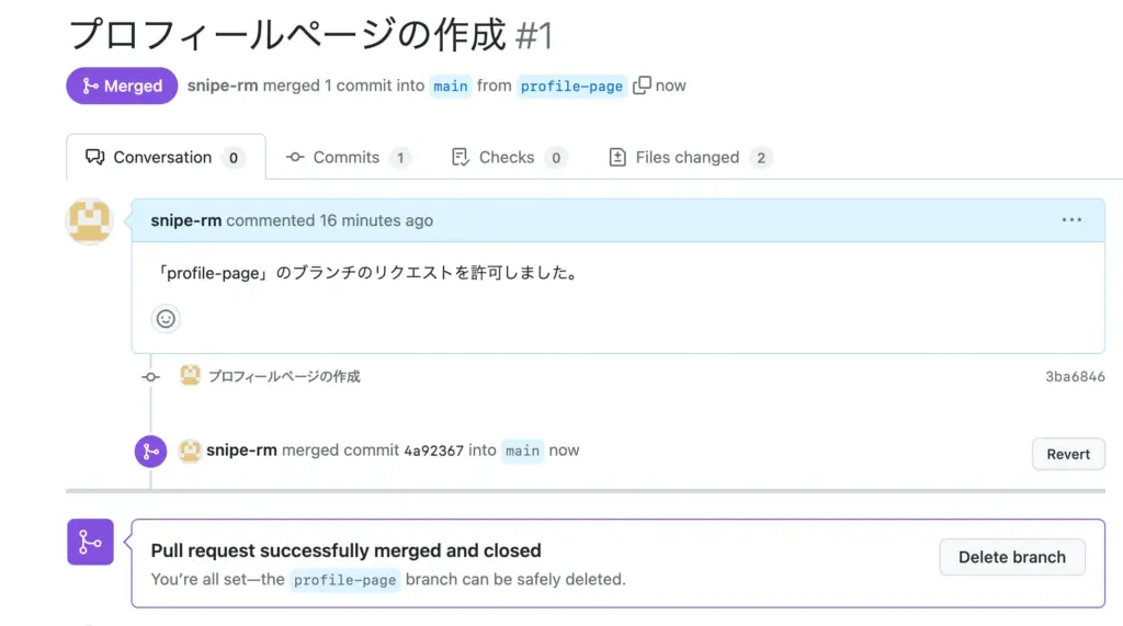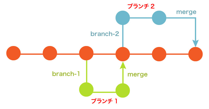複数のブランチを一つにまとめて、完成形に近づけることをマージと呼びます。(マスターブランチに統合させます。)
