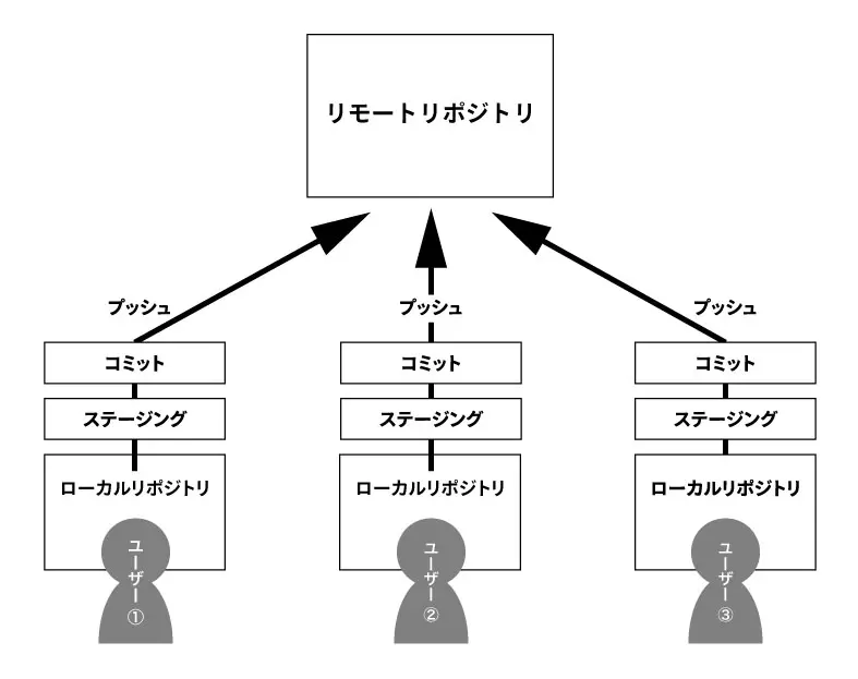 2種類のリポジトリに分けることで、普段の作業はそれぞれのユーザーが手元のローカルリポジトリで行い、作業内容を共有するときにリモートリポジトリで公開するという使い方になります。
